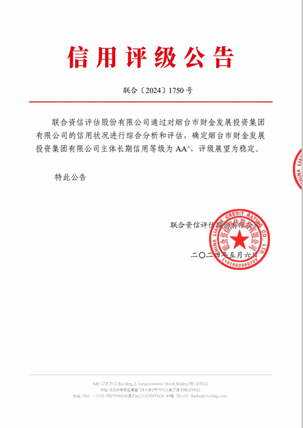 5月6日,經(jīng)國內專業(yè)評級機構聯(lián)合資信評估股份有限公司綜合分析評定,煙臺財金集團主體信用評級成功由“AA”上調至“AA+”,評級展望為“穩(wěn)定”。