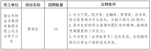 備注:市外首次來煙就業(yè)的35周歲以下(特別優(yōu)秀的年齡可適當放寬)非應屆畢業(yè)生,如有應聘意向,可先通過管培生崗位應聘,如符合煙臺市人才引進政策,且順利通過集團招聘考核,將根據(jù)應聘人員工作履歷情況,結合集團實際用工需求,主要分配到投資管理、融資租賃、保理、綜合文秘、運營管理等工作崗位。